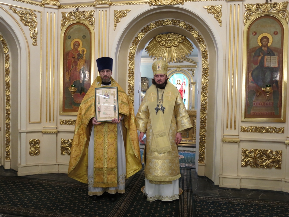 В завершении Владыка вручил по благословению Святейшего Патриарха Московского и всея Руси КИРИЛЛА общецерковную награду. В связи 50-летием со дня рождения, иерей Алексий Алексеев, клирик храма Живоначальной Троицы в Воронцове города Москвы, награжден Патриаршей Грамотой.