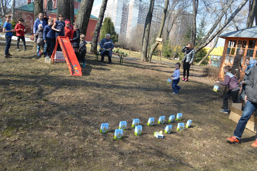 После праздничной трапезы, торжество продолжилось на свежем воздухе. Учащиеся пели песни в сопровождении гитары и баяна и играли в спортивные игры.. В завершение праздника ребята катали Пасхальные яйца с горки.