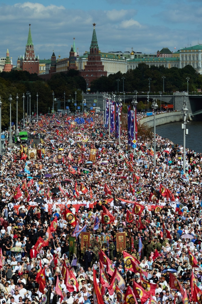 По окончании Литургии Предстоятель Русской Православной Церкви обратился к пастве с Первосвятительским словом, посвященным началу общемосковского крестного хода от кафедрального собора до Новодевичьего ставропигиального монастыря. Затем Святейший Патриарх возглавил крестный ход с молебным пением Московским святым. По историческому маршруту вместе со Святейшим Владыкой прошли архиереи и духовенство, монашествующие, члены общественных организаций, многочисленные верующие. Всего в крестном ходе с Предстоятелем приняли участие несколько десятков тысяч человек. В молебном пении участвовали архиереи и духовенство, сослужившие Его Святейшеству за Божественной литургией в Храме Христа Спасителя.