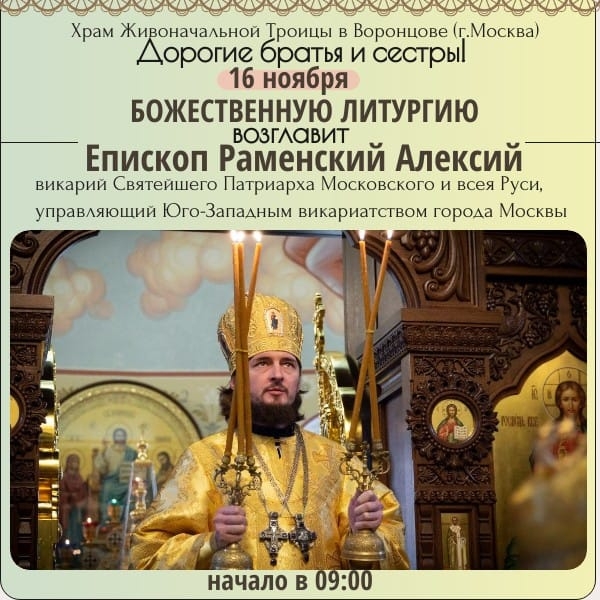 16 ноября Божественную Литургию в храме Живоначальной Троицы в Воронцове возглавит епископ Раменский Алексий